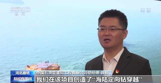 中国石油管道局工程有限公司总经理薛枫:我们在该项目创造了“海陆定向钻穿越”和“航道后深挖沟”两项世界纪录。标志着中国企业在大规模海管铺设、海陆定向钻穿越、单点系泊系统安装等成套业务领域的核心关键技术和安装能力达到世界先进水平。