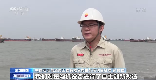 中国石油管道局工程有限公司孟加拉项目经理孙碧君:我们对挖沟机设备进行自主创新改造,实现最大后挖沟深度达11.9米;攻克了海上单点系泊装置水下毫米级对接技术;首次采用了独创的“海上扩孔及拖管工艺”,一次性穿越成功率100%。